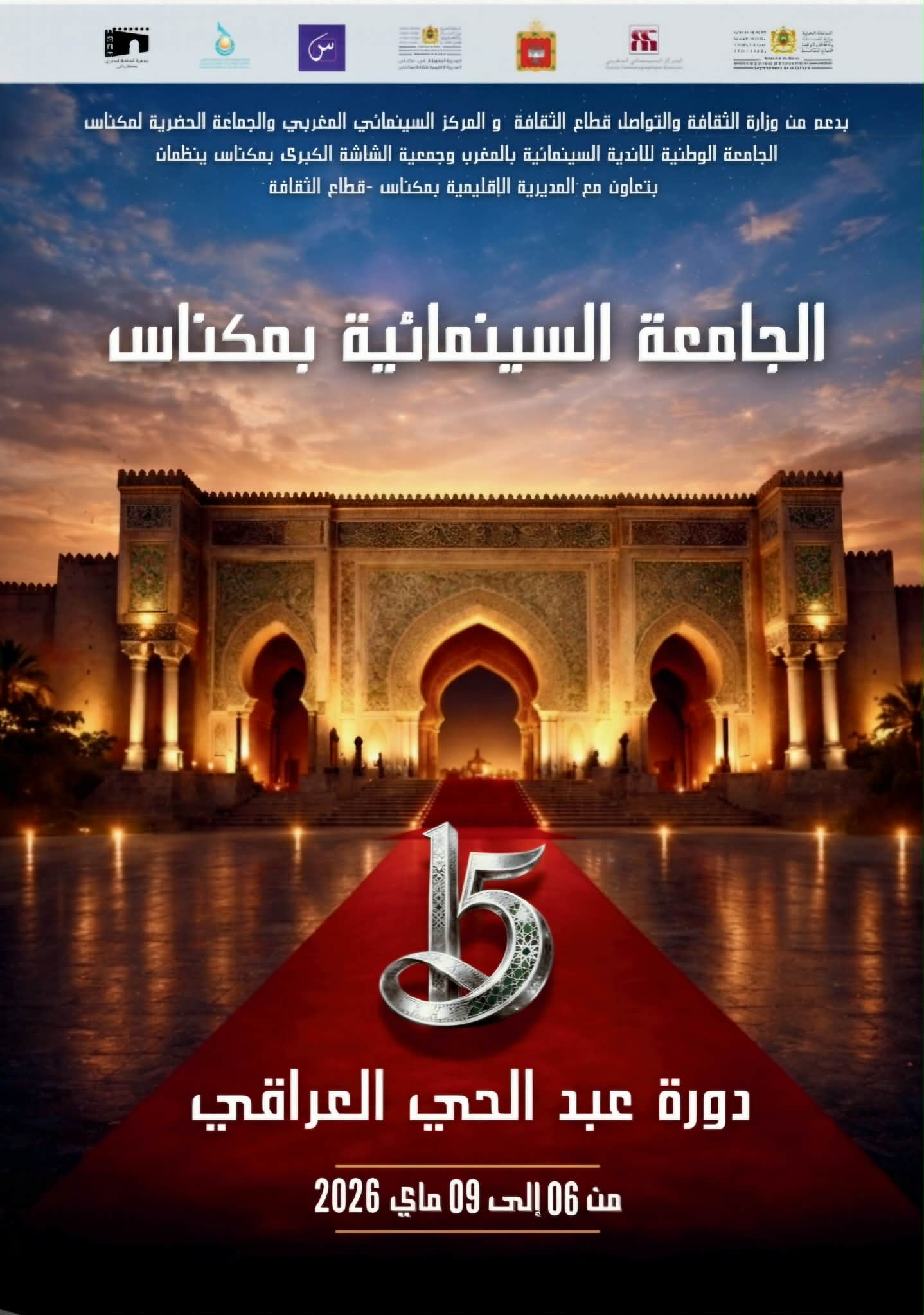 تستعد مدينة مكناس لاحتضان الدورة الخامسة عشرة للجامعة السينمائية التي تنظمها الجامعة الوطنية للأندية السينمائية بالمغرب بشراكة مع جمعية الشاشة الكبرى، وذلك خلال الفترة الممتدة من 6 إلى 9 ماي 2026. وتحتضن فعاليات هذه التظاهرة الثقافية مجموعة من الفضاءات، من بينها المركزان الثقافيان محمد المنوني وأناسي، إضافة إلى عدد من الفضاءات السينمائية والثقافية بالمدينة، في دورة تحمل شعار “السينما للجميع”.